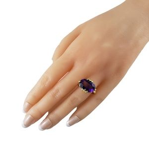 This lovely ring features one oval amethyst (17 mm x 13 mm) and ten round brilliant cut diamonds set in classic 18K yellow gold.