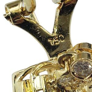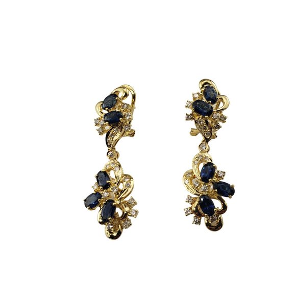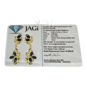 These elegant drop earrings each feature 22 round brilliant cut diamonds and five oval sapphires (approx. 5 mm x 3 mm each) set in beautifully detailed 18K yellow gold.