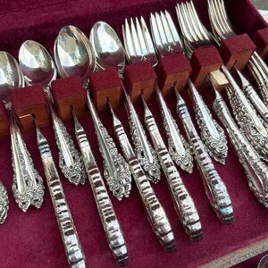 This silver-plated flatware set features intricate vintage patterns, offering both functionality and timeless elegance for dining or collection purposes.