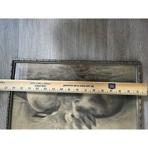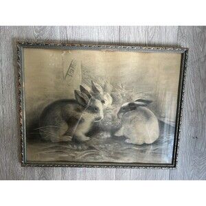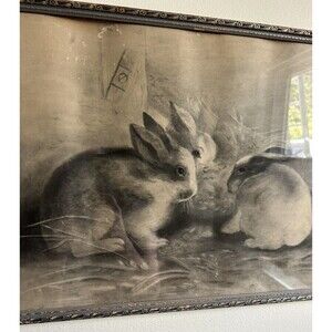 Vintage 1895 Bunny Rabbit Charcoal Crayon Drawing Framed Art Cottage Decor