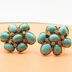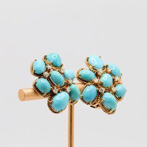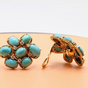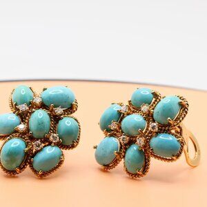 Vintage 18K Gold Family Heirloom Turquoise Diamond Clip On Earrings