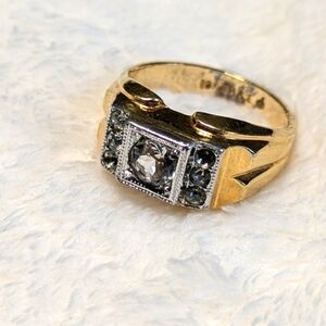 Men's 1 Carat CZ with 3 round CZ on either side 18k gold plated, stamped inside the band no makers Hallmark all stones intact size 10-1/2" excellent condition circa late 1980's