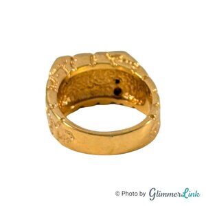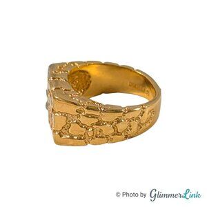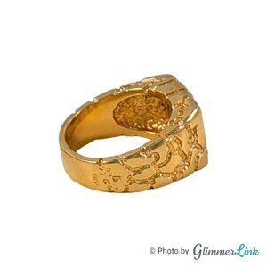 Vintage gold plated nugget men's ring accented with 3 clear crystals within a silver tone rectangle.
