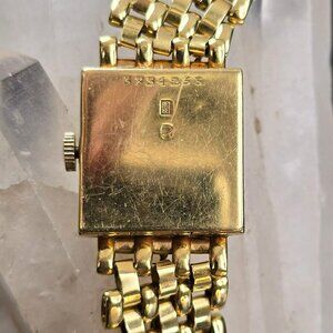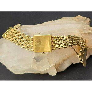 This vintage women's watch features an 18k yellow gold bracelet band and a square face surrounded by diamond accents. The intricate chain detail adds a touch of sophistication, making it a refined choice for those who appreciate classic elegance and timeless style in their accessories.