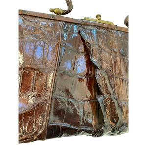 Vintage Gorgeous and XL 12" chocolate brown early 1900's Edwardian hornback alligator handbag with full osteoderms (back scales) that wrap from front to back. Skins are fabulously supple and glossy with double brass top locks and clasp (work perfectly!) and skin covered top handle, in great condition. The interior genuine leather interior with one long open side pocket is not in the best condition. There are no rips or tears in the leather however. Really the only flaw. A nice large bag which is in great condition for it's age. Incredible exterior condition