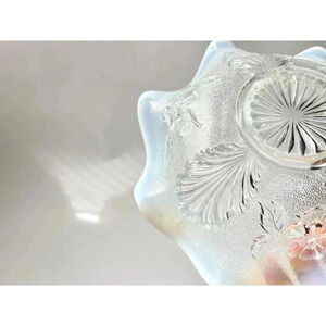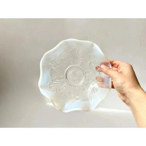 Vintage ruffled Northwood floral made clean opalescent clear & white bowl. Ruffled edges. "Blossoms & Palms" design. Starburst center with a narrow base. Early American style pressed glass by Northwood which was based out of PA, USA. Clear center with opaque / white edges. Wonderful idea for Christmas decor. Made in 1905.