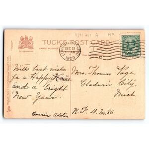 Printed by the renowned Raphael Tuck & Sons as part of their 'Christmas Series No. C1735', this chromographed postcard is a fine example of early 20th-century holiday greetings. The back shows a Canadian one-cent stamp postmarked in London, Ontario, dated December 21, 1909, and includes a handwritten message wishing a Happy Xmas and a bright New Year. Collectors of antique Christmas postcards or vintage wildlife imagery will appreciate this piece's historical significance and artistic detail.