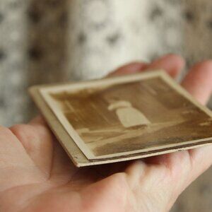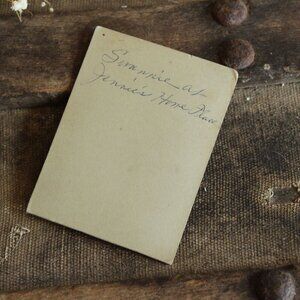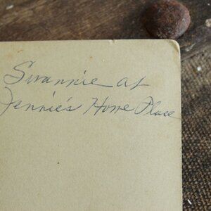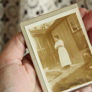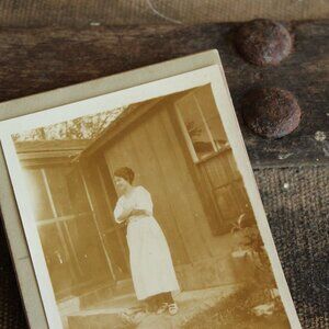 Wonderful vintage antique photo portrait of a smiling woman outside a house circa the 1910s. This is a sepia toned black and white mounted on a card. The entire thing measures about 3.5" tall x 2.5" wide. There is a name written on the back "Swannie at Jennie's Home PLace"