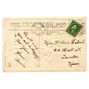 In the early days of 1913, this exquisite postcard traveled across states, carrying heartfelt New Year wishes. Adorned with vibrant red flowers and a serene winter scene, it evokes a bygone era's charm. A glimpse into history, this piece of correspondence connects the past with the present, a tangible memory of olden times.