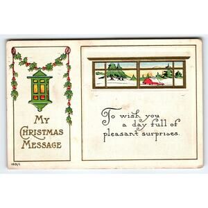 This charming vintage Christmas postcard from 1915 features a classic holiday design with a green lantern and holly garland on the front, accompanied by a warm seasonal greeting: "To wish you a day full of pleasant surprises." The card showcases a small winter landscape through a window pane, depicting a snowy scene with evergreens and a red-roofed cabin bathed in soft twilight hues. The postcard measures the standard 5.5 x 3.5 inches, typical of early 20th-century holiday cards.