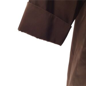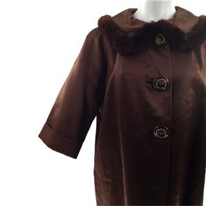chocolate brown silk and fur coat with three quarter sleeves, fur trim, collar, three large art deco brown, translucent and brass buttons, has. Tiny Spot-on front. Can barely see it, sleeve cuffs has a few small age spots. See pictures for details other than that is in excellent vintage condition. No size or material tags.