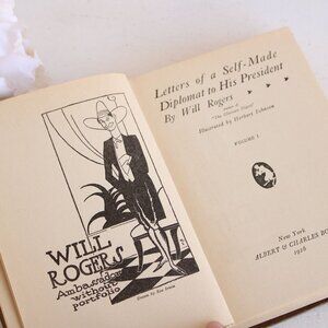 Vintage 1920s book by Will Rogers, 'Letters of a Self-Made Diplomat to His President". Published in 1926 and from my research this is believed to be a First Edition.. Brown cloth with dark blue lettering. Measures about 7.5" tall by 5" wide. Published by Albert & Charles Boni.. 263 Pages. Illustrated by Herbert Johnson. This is Volume ONe but Rogers declared he never intended a Volume Two, it was just part of his unique humor and charm!