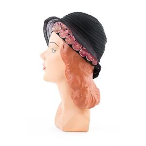 Vintage 1920s Cloche 20s Velvet Floral Black Woven Summer Evening Hat with Bow