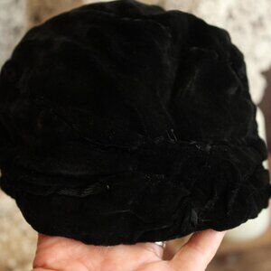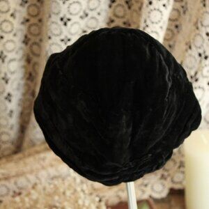 Stunning vintage cloche hat from the 1920s n black velvet. Striking stitching and pleats in the velvet. The inside is lined and there is grosgrain round the bottom inside. Looks and feels like a silk velvet and the lining may also be silk. Label reads: Southern California Modes, and another reads Victoria. Measures about 22.5" round the inside. This will ship flat as it is crushable.