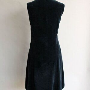 Charming vintage 1920s dress and jacket set. Not quite a navy blue, more of a darkest teal color really. Cotton velvet. The dress is sleeveless with a tulip hem and a V neck. Snaps on the side. No label. The jacket is open in front and has snaps at the wrist.