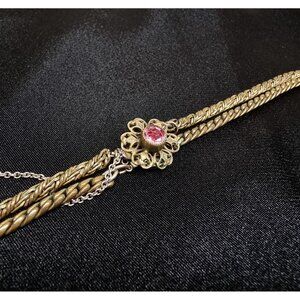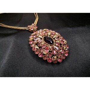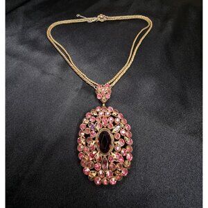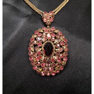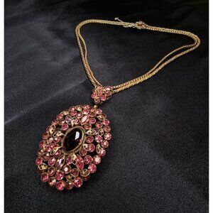 Vintage 1920s-1930s Gold-Tone Necklace With Pink & Ruby Red Rhinestone Oval Pend