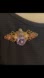 The 1928 brooch features a cherub figure cradling a heart-shaped design, adorned with pink teardrop jewels, faux pearls, and a purple rose. The cherub, in a silver-tone finish, sits atop the heart, which is outlined with small faux pearls. Two larger, baroque-style faux pearls are placed on either side of the cherub. The heart is further embellished with two pink teardrop-shaped jewels set in a gold-tone filigree. Below the cherub, a purple rose with a faux pearl center adds a touch of color. The entire design is framed by an ornate, gold-tone filigree that extends outward from the heart, giving the brooch a winged appearance. In excellent condition with minimal age/wear. Please see all photos for more details and measurements!