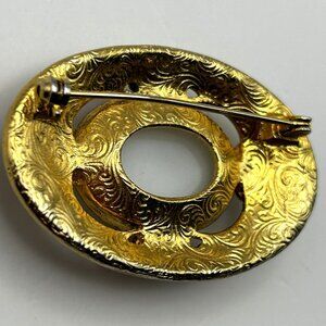 Vintage 1928 Jewelry Co brooch and clip-on earrings set in gold tone filigree with oval white faux moonstones and small faux pearl accents. Victorian Revival design with ornate detail.