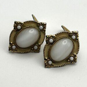Vintage 1928 Brooch Clip On Earrings Set Faux Moonstone & Pearl Gold Tone