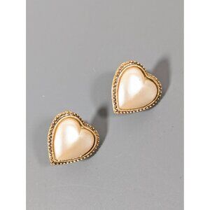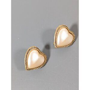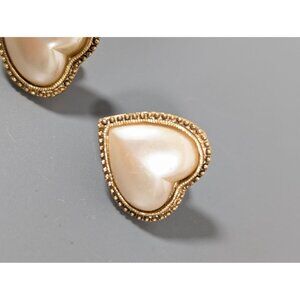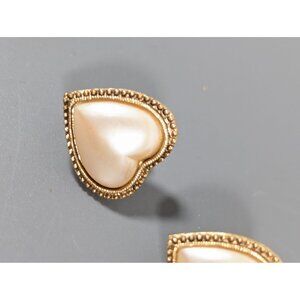 Elegant vintage 1928 clip-on earrings featuring faux pearl heart cabochons and a gold-tone finish. Perfect for adding a touch of classic charm to any ensemble.