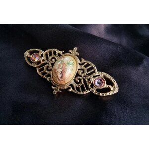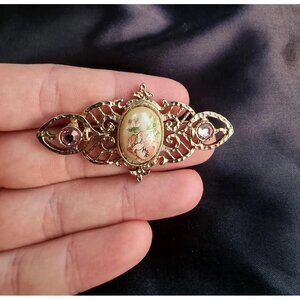 Each brooch showcases a raised oval cameo cabochon adorned with delicately painted pastel florals, framed by ornate openwork gold-tone filigree. The top brooch is enhanced with two amethyst-colored rhinestones, adding a soft sparkle to its vintage charm.