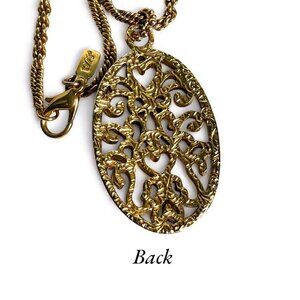 Vintage 1928 Jewelry Gold Tone Filigree Oval Pendant Necklace