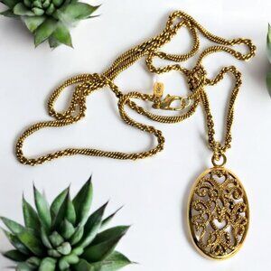 FEATURES: 32” long necklace by 1928 Jewelry Company, known for their ornate Victorian and Art Deco–inspired designs / Large oval filigree design with intricate scrollwork and beaded details / Gold tone rope chain / Lobster claw with signature 1928 Jewelry tag / 1990s / see photos for more details