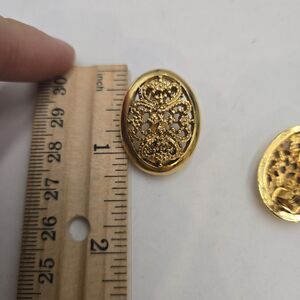 Vintage 1928 Jewelry Brand Gold Tone Filigree Domed Clip On Oval Earrings