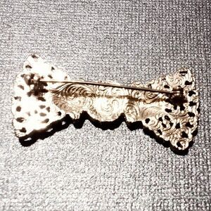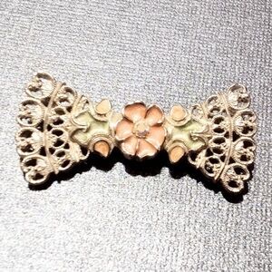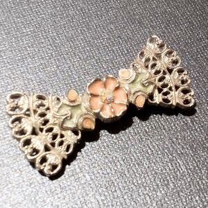 This charming vintage bow brooch is made by 1928 Jewelry and showcases the brand's signature romantic style. Fashioned in a silver tone finish, the brooch features an elegant bow design with a delicate pink and green enameled flower at the center, adding a soft, feminine touch. It measures 2" in length by 7/8" in width and is in beautiful condition—an ideal piece for collectors or lovers of vintage-inspired accessories.