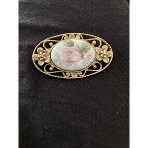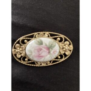 Vintage 1928 Oval Pink Porcelain Rose Brooch Gold tone Filigree Floral Pin
