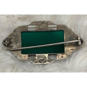 Step back into the glamour of the 1930s with this stunning Art Deco brooch, crafted in sterling silver and stamped Germany. A bold rectangular green agate cabochon takes center stage, framed by sparkling marcasites in a geometric filigree design.