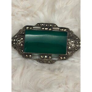 Vintage 1930s Art Deco Sterling Silver Green Agate & Marcasite Brooch - Germany