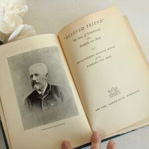Incredible vintage book from the 1930s. Beloved Friend; The Story of Tchaikowsky and Nadejda von Meck" by Catherine Drinker Bowen and Barbara Meck. Tells the true story of a friendship between the adored composer and von Meck. Includes letters that were hidden away for years by von Meck's family. Blue cloth bound hardback cover with black and gold gilt graphics. Published by Random House in 1937. Measures approx. 8.75" x 6". There is an old name tag inside, and a flyer in the back.