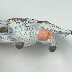 Britain's steer figure 1930s collectibles with this delightful. Carefully crafted in England, this lead toy captures the rustic beauty of farm life & showcasing brown spots and distinct craftsmanship. The vintage piece bears the hallmark of an era where toys were miniature works of art. This figure has weathered the years, showing gentle signs of wear.