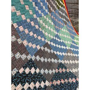 This vintage 1930s fabric postage stamp quilt showcases a rustic charm and intricate craftsmanship. Measuring 77.5x78 inches, it adds warmth and character to any space, making it a timeless piece for collectors and home decorators. The front of this quilt is made from cotton older 1930s fabric. The border and the back seem to be some kind of blend fabrics. This is all hand stitched. The back has a tiny faint spot on the top edge. Otherwise this is clean and free of holes.