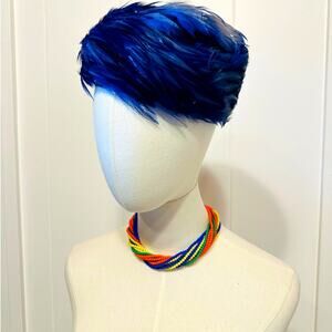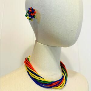 Step into the glamour of the 1930s with this stunning vintage jewelry set. Featuring a bold multi-strand necklace paired with matching clip-on earrings, this set showcases vibrant Japan glass beads in a bright, eye-catching mix of colors. Each bead is beautifully crafted, adding depth, shine, and dimension to the ensemble.