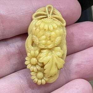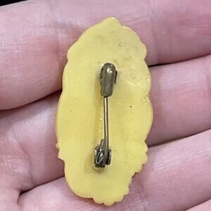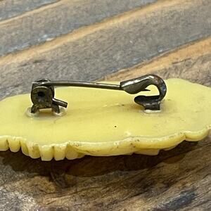 This vintage brooch is a beautiful piece of art featuring intricately hand-carved flowers. Made of ivory pale yellow colored celluloid.