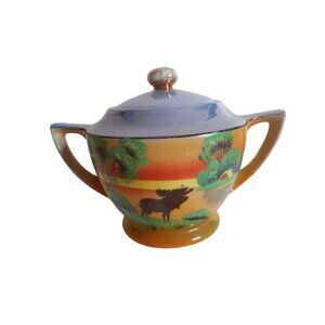 Vintage 1930s Blue Luster Tea serving set Pot Sugar Plates Moose / Wilderness Motif Japan handpainted