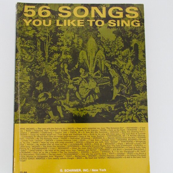 Description: Up for sale is a vintage (1937) 56 Songs You Like To Sing sheet music songbook published by G. Schirmer Corporation in paperback format. The book is designed for piano, chords, or vocals. This songbook contains 56 popular songs from earlier years. This songbook is in fabulous vintage condition (pages are yellowed but not tender). This songbook has no writing or other notations inside this book.