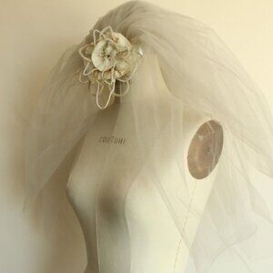 Gorgeous vintage bridal veil, circa the 1940s or 1950s with winter white tulle and a rosette with faux pearl trim. Blusher or elbow length. No label.