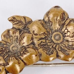 Mid-century dogwood-style wreath brooch in warm gold tone, crisply cast with layered petals and antiqued detail.