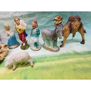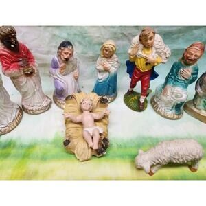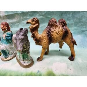 This is a vintage 1950s chalkware 13pc nativity set. The figures are mostly in good pre-owned condition with minor chips. The camel is missing a foot. Please see pictures and feel free to let me know if you have any questions.