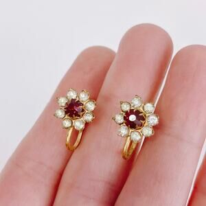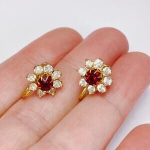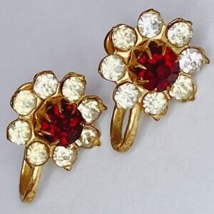 Vintage 1940s 1950s Gold Tone Screw Back Earrings Red Glass Rhinestone Floral