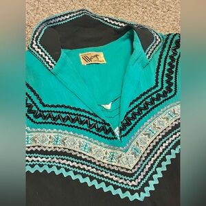 Gorgeous patio western skirt set by Porters Western, PHX, which was SUPER popular in all of Arizona. Made in charcoal gray with turquoise, white, silver & black decorative ric rac trim. Very full skirt!