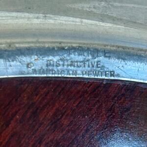 Vintage Art Deco-style cocktail tray featuring a round Formica insert with faux wood grain, set in a pewter-tone metal rim marked “Distinctive American Pewter.” Measures approximately 13.25” in diameter. This mid-century bar tray adds a sleek retro touch to your home bar, kitchen, or coffee table setup.