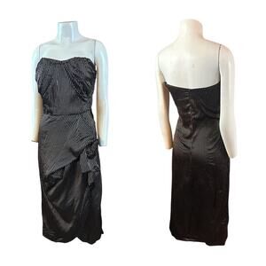 Step into timeless glamour with this striking vintage pinstripe cocktail dress. Crafted from a silky black fabric with subtle stripes, this strapless beauty features a ruched bodice, flattering sweetheart neckline, and a dramatic draped skirt that hugs your curves in all the right places. The asymmetrical detail at the hip adds a bold touch of flair.