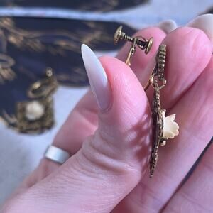 Vintage 1940s Brass Tone Celluloid Rose Intricate Floral Filigree Earrings A1