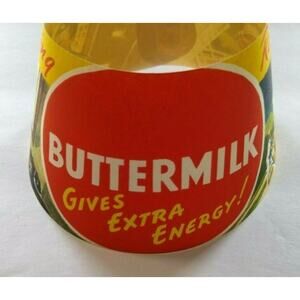 Super cool graphics on this 4" x 2.5" round unused new old stock condition buttermilk bottle paper collar. Has slight age wear only. Inside has formed tabs that have been attached to make item cone shaped.