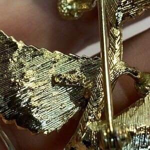 This vintage Coro leaf brooch features a sophisticated brushed gold tone, highlighting its autumn-inspired design. Perfect for adding a touch of elegance to any outfit, its folded structure creates a three-dimensional effect.