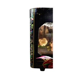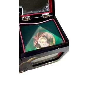 *Has abalone/mother of pearl inlay on black lacquer, two separate winding music boxes (one for each dancer) they both work wonderfully, both dancers spin while the music plays, pink velvet lined, two mirrors, multiple compartments to store your jewelry, and collectible trinkets, hand crafted and hand painted Japanese treasure.